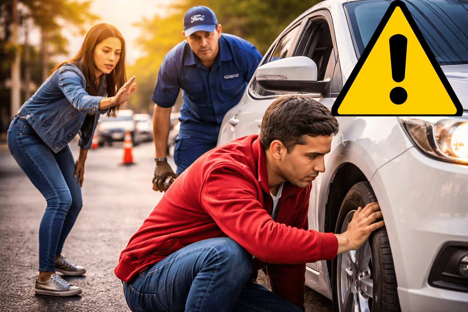 Al descender para verificar, un hombre con uniforme azul —aparentemente de la marca Ford— se aproximó y ofreció llevar el auto a un supuesto taller cercano para revisión.