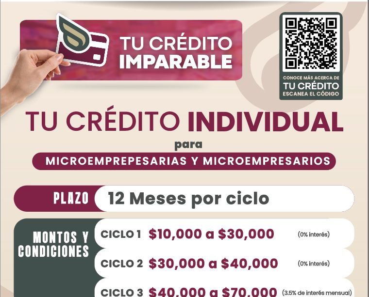 Para personas con negocios establecidos de al menos un año en el municipio, permite acceder a montos de 10 mil a 70 mil pesos en hasta tres ciclos.