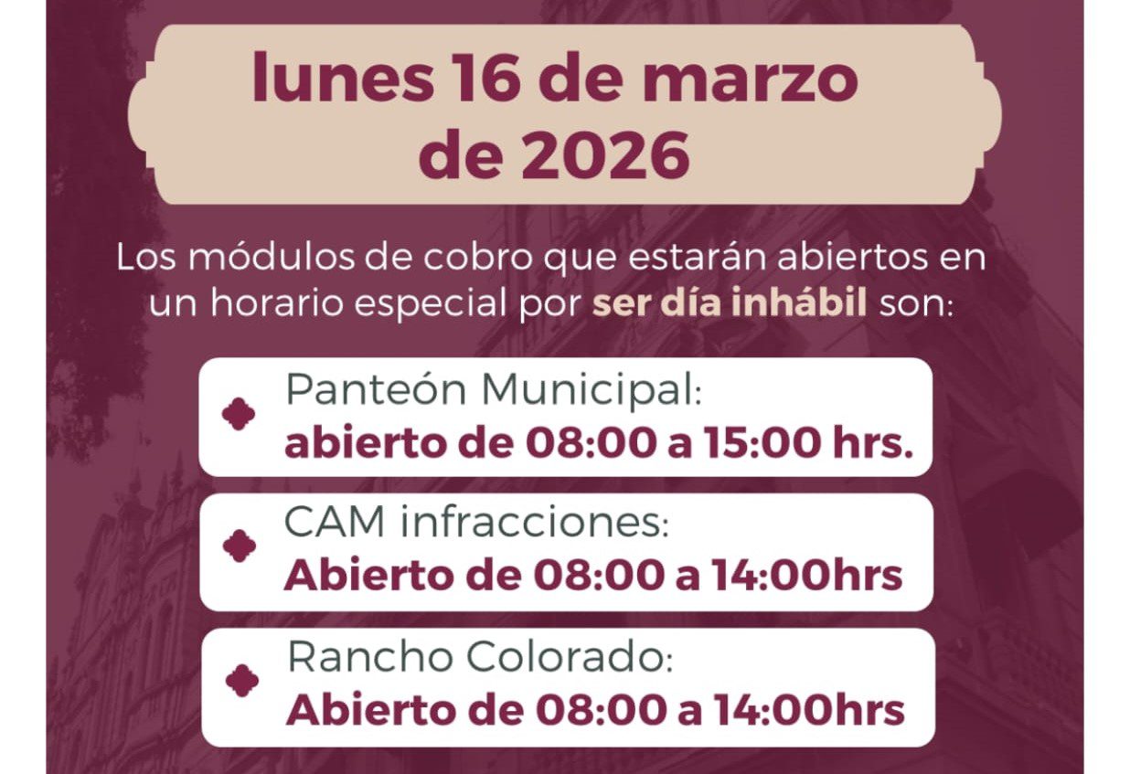 Los módulos del CAM Infracciones y Rancho Colorado estarán abiertos en un horario de 8:00 a 14:00 horas, mientras que el Panteón Municipal brindará atención de 8:00 a 15:00 horas.