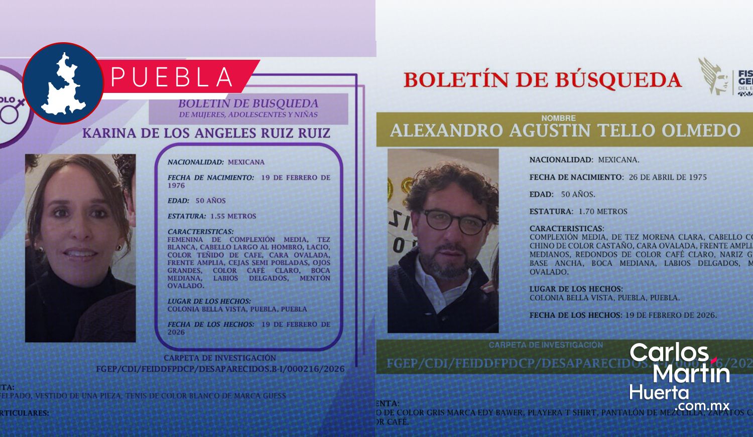 Karina de los Ángeles Ruiz Ruiz y Alexandro Agustín Tello Olmedo, ambos de 50 años de edad, son una pareja que fue vista por última vez el jueves 19 de febrero de 2026 al salir de su hogar ubicado en la colonia Bella Vista, en la ciudad de Puebla.