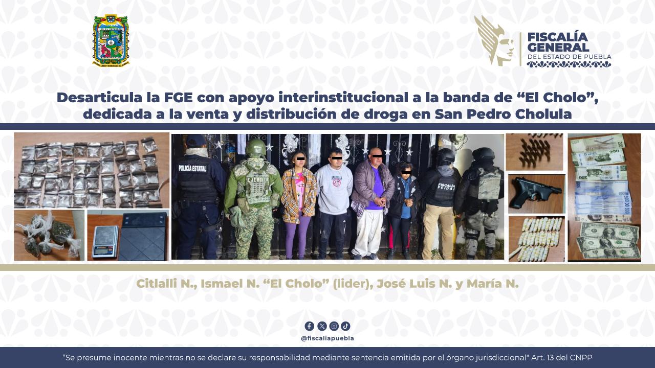 Como resultado de labores estratégicas de inteligencia y campo, la Fiscalía General del Estado de Puebla (FGE), en coordinación con fuerzas federales y estatales, ejecutó la desarticulación del grupo delictivo liderado por “El Cholo”, dedicado presuntamente a la venta y distribución de estupefacientes en la región.