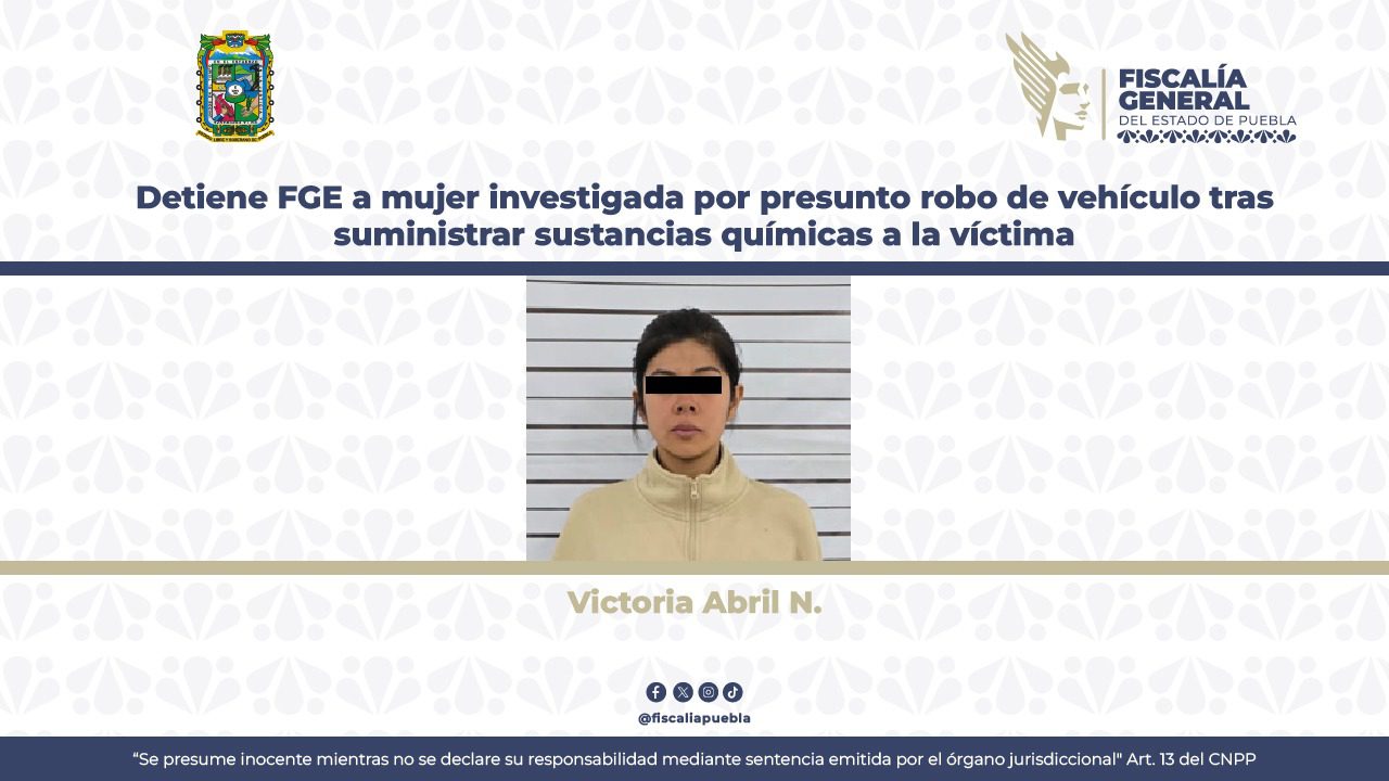 La Fiscalía General del Estado de Puebla (FGE Puebla) ejecutó con éxito una orden de aprehensión contra Victoria Abril N., señalada como presunta responsable del delito de robo de vehículo agravado. La detención se realizó en la colonia Ex Hacienda Castillotla, en coordinación con agentes investigadores especializados.