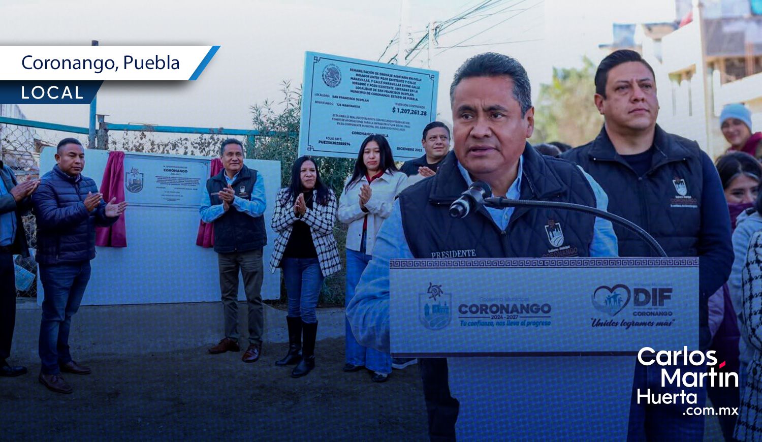 El presidente municipal de Coronango, Armando Aguirre Amaro, encabezó la entrega oficial de la rehabilitación del drenaje sanitario en la junta auxiliar de San Francisco Ocotlán.