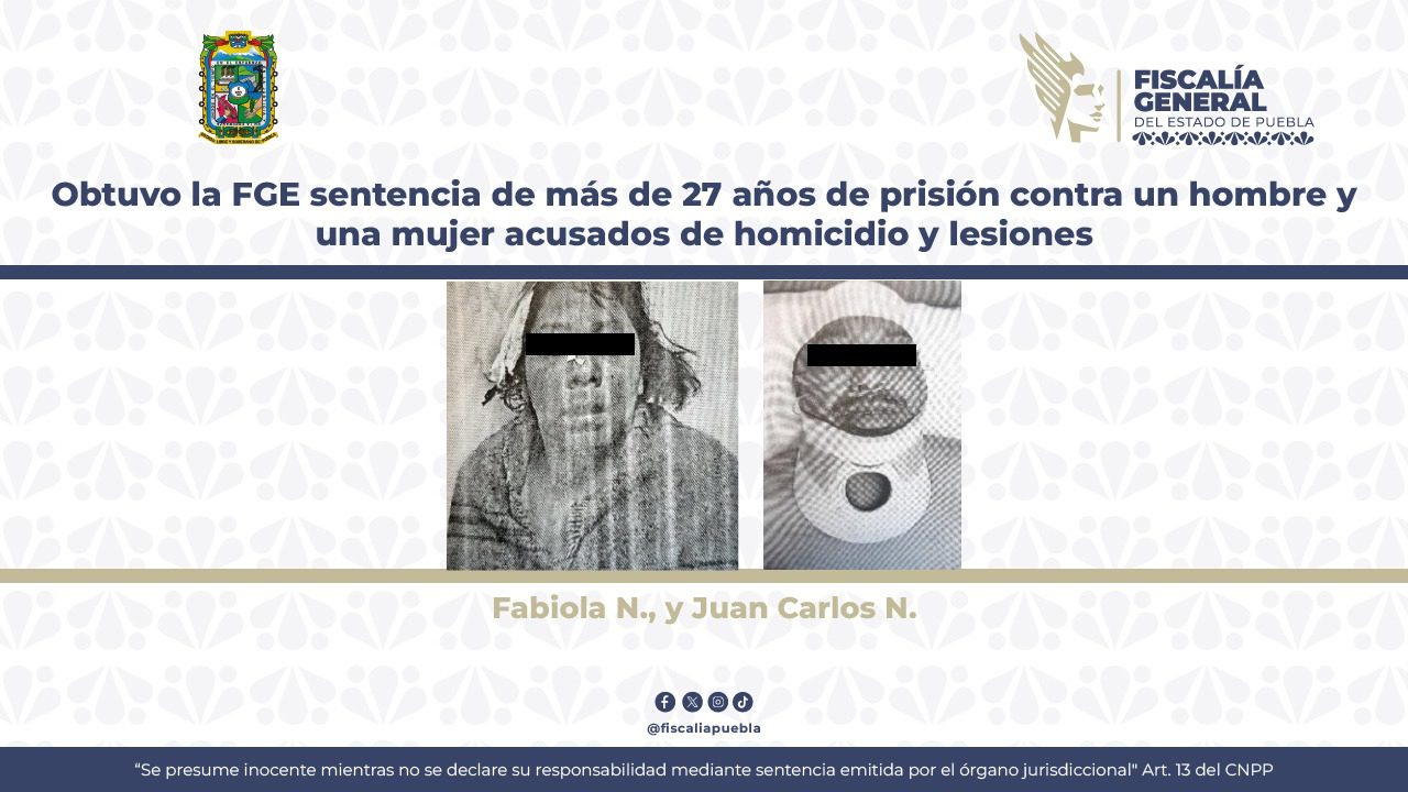 La Fiscalía General del Estado obtuvo una sentencia condenatoria de más de 27 años de prisión en contra de Fabiola N., y Juan Carlos N., luego de acreditarse de manera plena su responsabilidad penal en los delitos de homicidio y lesiones calificadas. La resolución judicial se logró tras la integración y desahogo de evidencias periciales, técnicas y científicas que fortalecieron la teoría del caso presentada por el Ministerio Público, permitiendo demostrar la participación activa de los acusados.