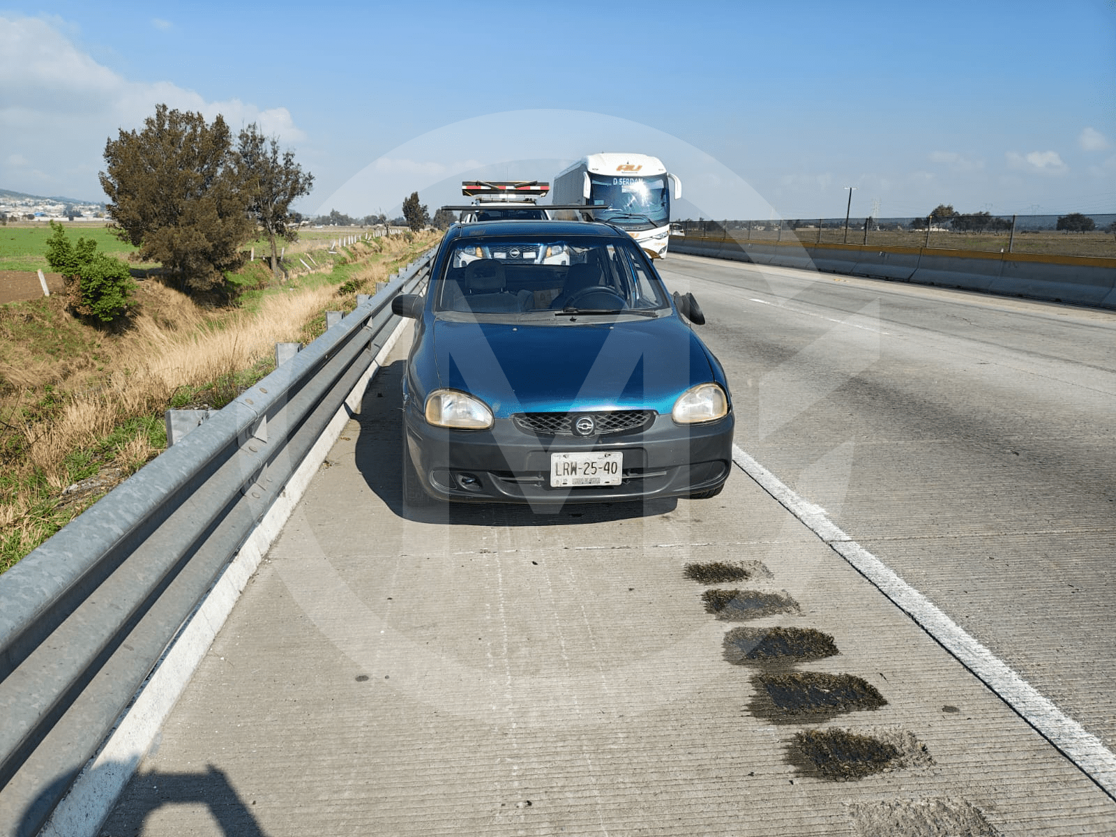 Aproximadamente a 500 metros del sitio del hallazgo, específicamente en el kilómetro 151, se localizó un vehículo Chevrolet Chevy color azul, con placas del Estado de México, el cual presentaba daños visibles y cristales rotos.