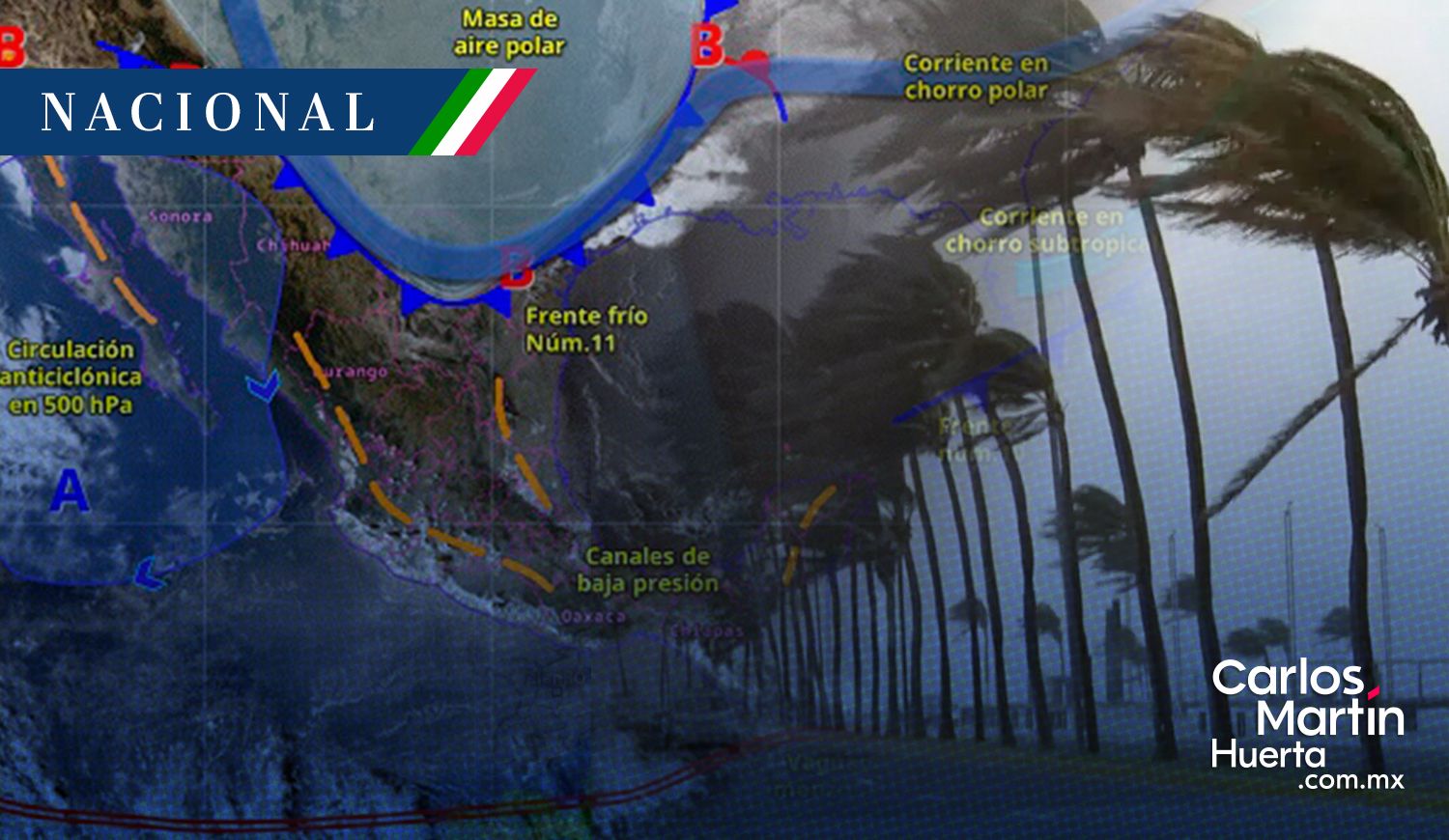 El frente frío número 11 y la masa de aire polar asociada avanzan con rapidez sobre el Golfo de México, provocando un panorama de clima severo: lluvias puntuales intensas en el sureste, un marcado descenso de las temperaturas en la mayoría del país y un Evento de “Norte” violento con rachas de hasta 100 km/h en costas del Golfo de México.