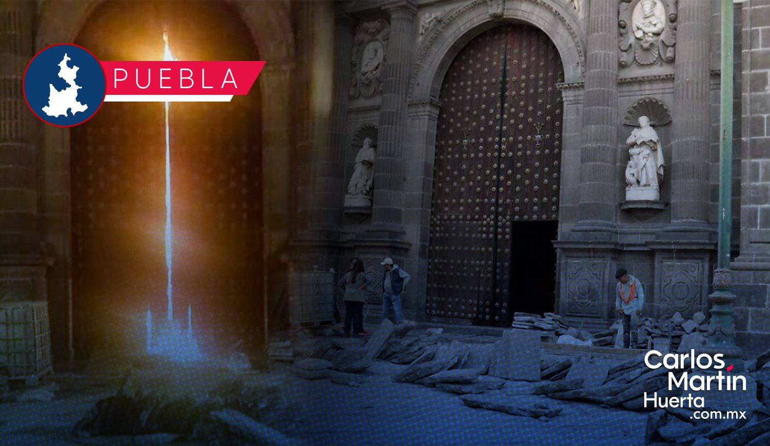 Inicia la restauración del portón de la Catedral de Puebla tras incendio por vandalismo