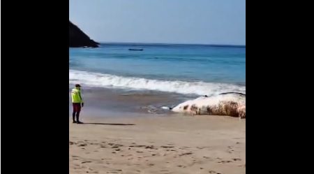 La tarde del pasado viernes, se reportó el hallazgo de una ballena sin vida en la playa Mezcales, ubicada en la zona de Punta Pérula. Tras el reporte, elementos de la Unidad Estatal de Protección Civil y Bomberos de Jalisco se trasladaron al sitio para confirmar el evento y evaluar las condiciones del ejemplar.