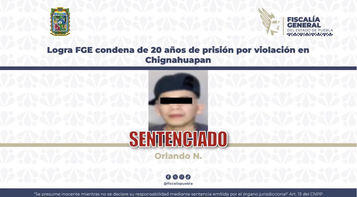 La Fiscalía General del Estado de Puebla (FGE) obtuvo sentencia condenatoria contra Orlando N., responsable del delito de violación en agravio de una adolescente, por hechos ocurridos en el municipio de Chignahuapan.