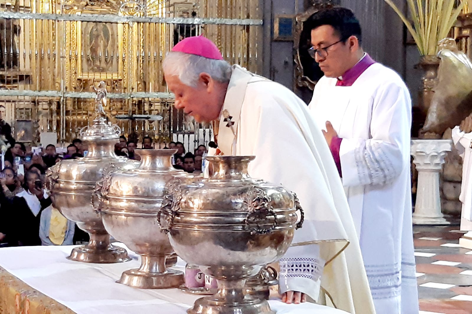 El arzobispo de Puebla, Víctor Sánchez Espinosa, encabezó la celebración donde realizó la consagración y bendición de los elementos que darán vida a los sacramentos durante el resto del año:
