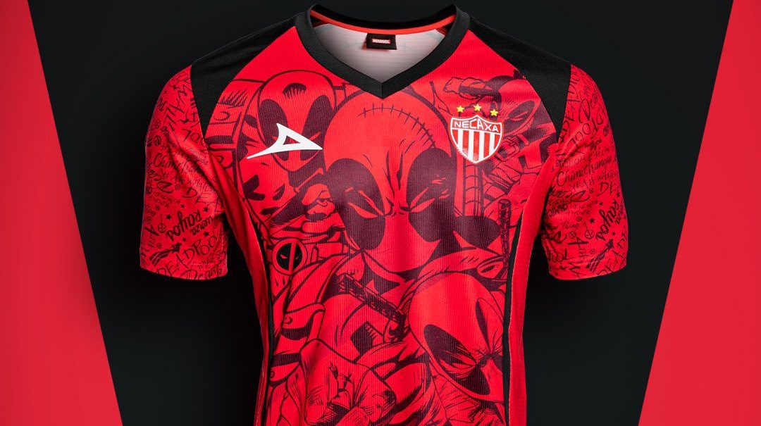 - La camiseta incorpora el logo del Necaxa y el de Pirma. Se aprecia una serie de estampados del comic de Deadpool a lo largo de la tela.