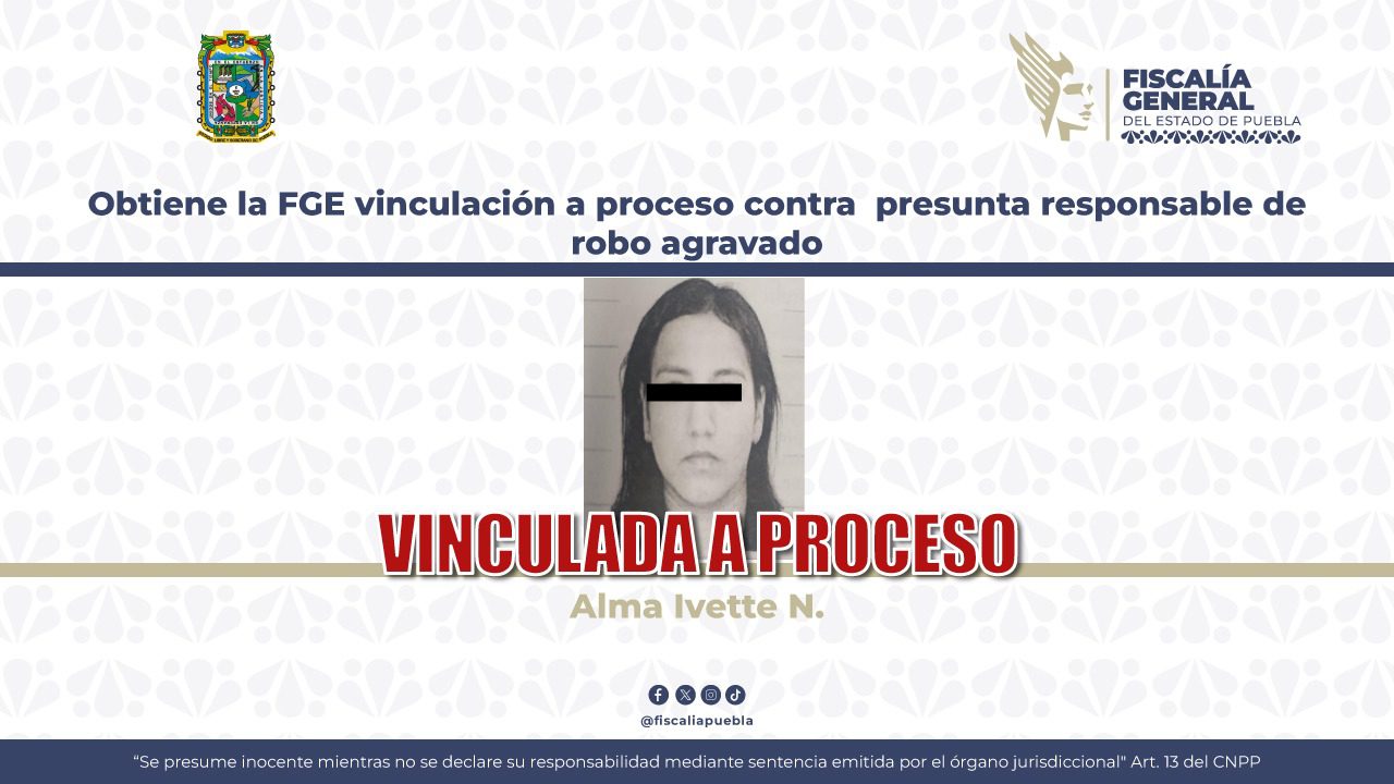 La Fiscalía General del Estado de Puebla obtuvo la vinculación a proceso y prisión preventiva en contra de Alma Ivette N., por su probable responsabilidad en el delito de robo agravado.