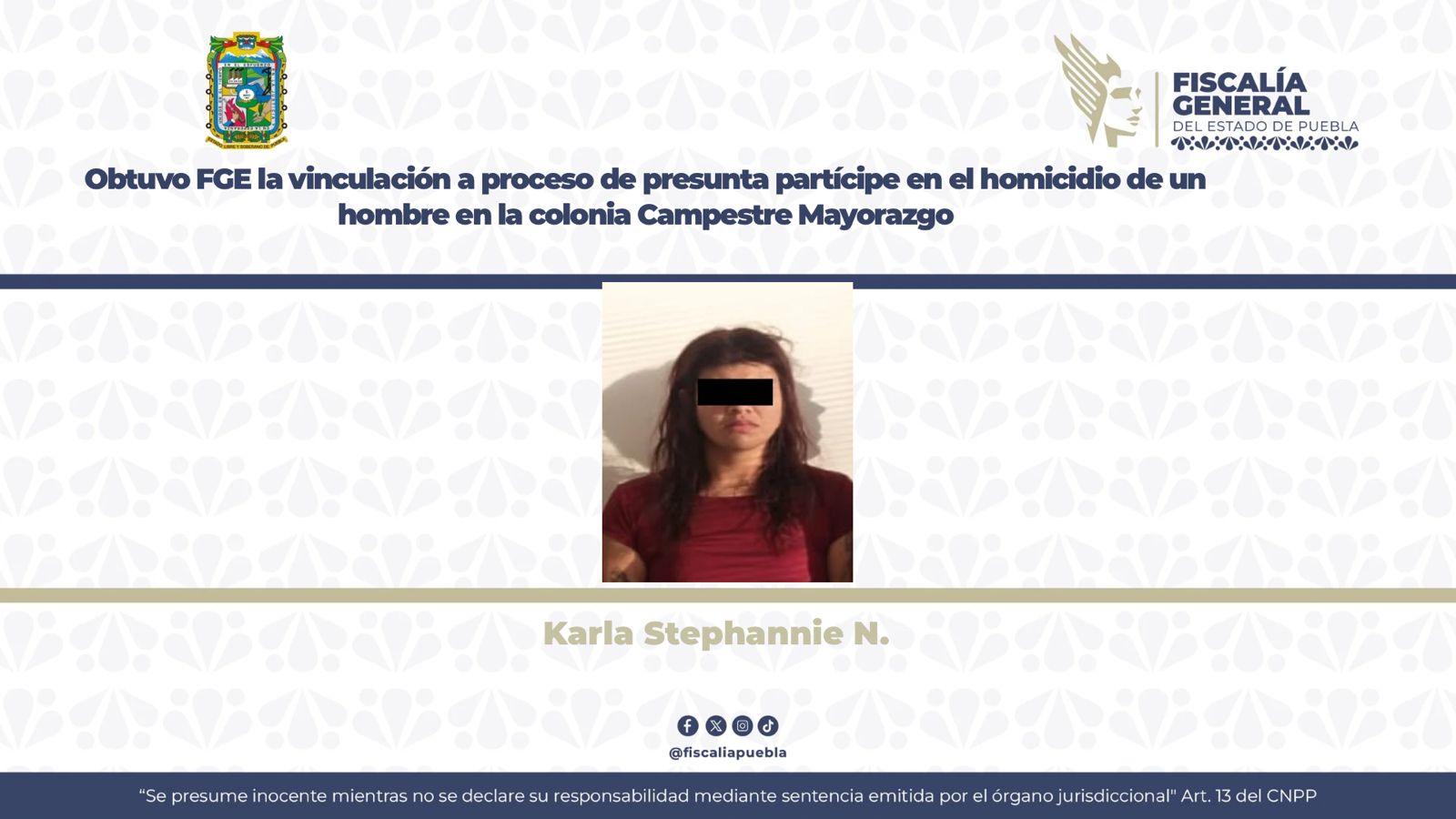 La Fiscalía General del Estado informa que, a partir del análisis integral de indicios y dictámenes periciales incorporados a la carpeta de investigación, se obtuvo la vinculación a proceso y la medida cautelar de prisión preventiva oficiosa en contra de Karla Stephannie N., señalada como probable responsable del delito de homicidio calificado.