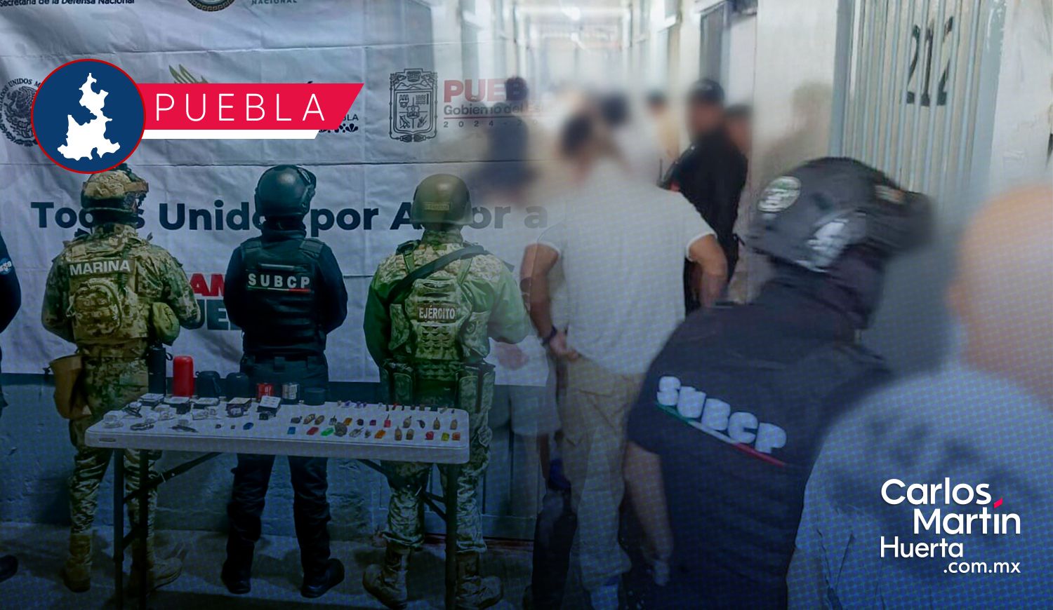 En el centro penitenciario de San Pedro Cholula y con apoyo de la Secretaría de Marina (SEMAR), Secretaría de la Defensa Nacional (DEFENSA) y Guardia Nacional (GN), se aseguraron 23 objetos punzocortantes, cinco bocinas, accesorios para equipos telefónicos y otros artículos prohibidos.