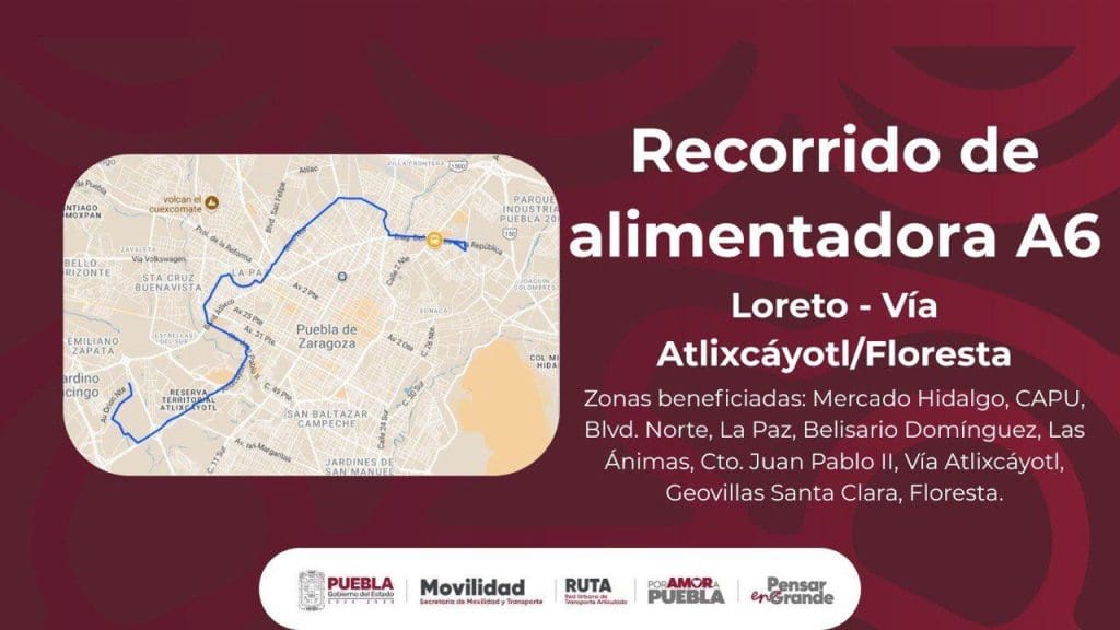 - Ruta A6: Mercado Hidalgo, CAPU, Blvd. Norte, La Paz, Belisario Domínguez, Las Ánimas, Cto. Juan Pablo II, Vía Atlixcáyotl, Geovillas Santa Clara, Floresta.