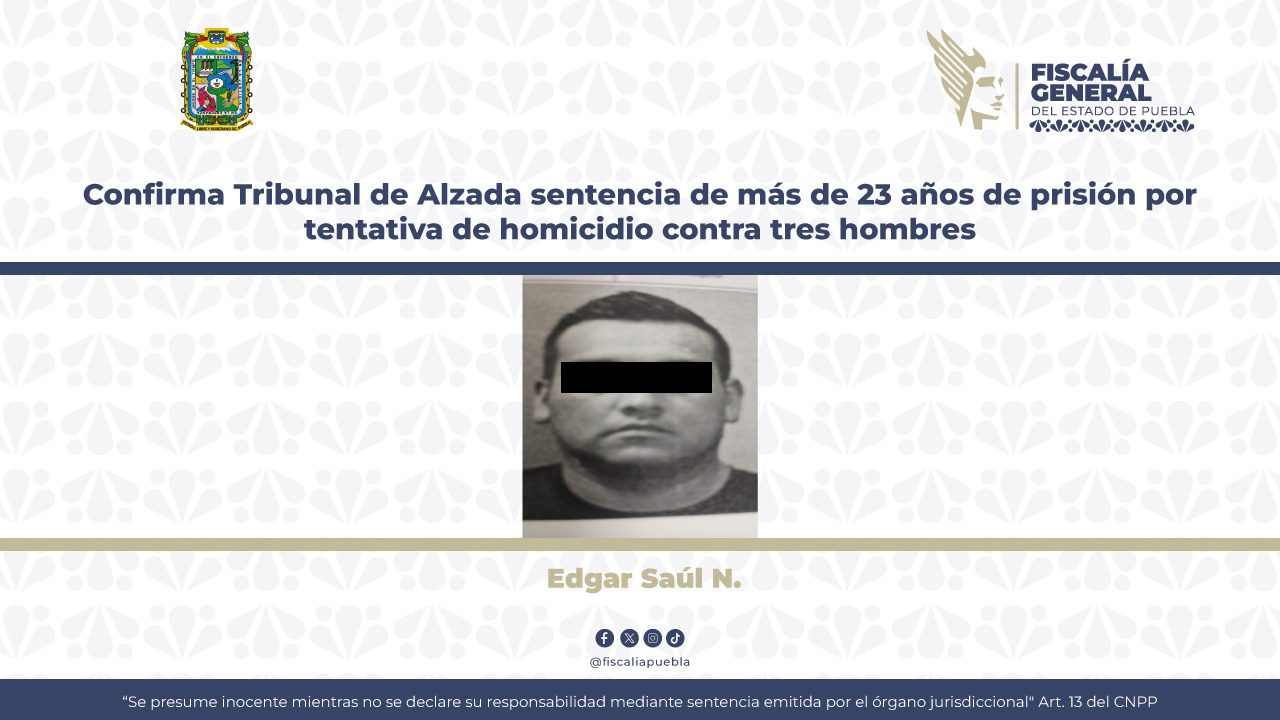 El Tribunal de Alzada confirmó la sentencia de más de 23 años de prisión dictada contra Édgar Saúl N., esto gracias a los argumentos presentados por la Fiscalía General del Estado de Puebla, que acreditaron su responsabilidad en el delito de tentativa de homicidio calificado cometido en agravio de tres hombres.