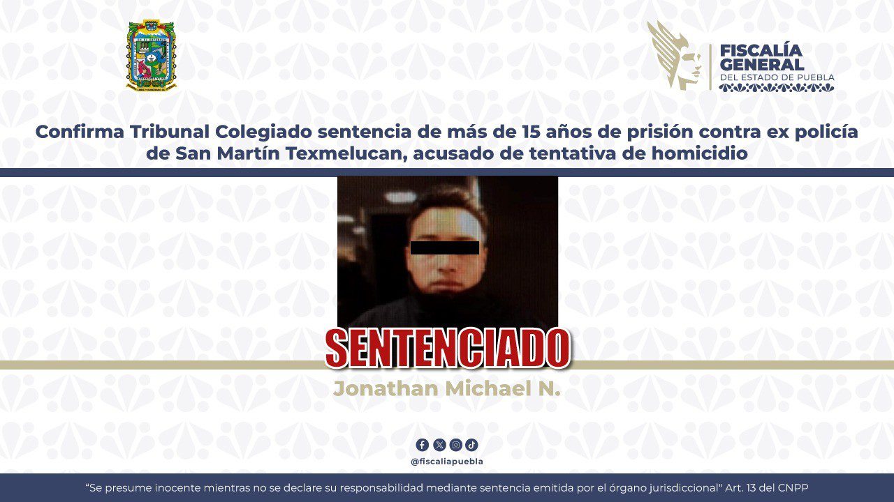 La Fiscalía General del Estado de Puebla informa que el Tribunal Colegiado confirmó la sentencia de 15 años 10 meses de prisión, dictada en contra de Jonathan Michel N., acusado de homicidio calificado en grado de tentativa en el municipio de San Martín Texmelucan, Puebla.