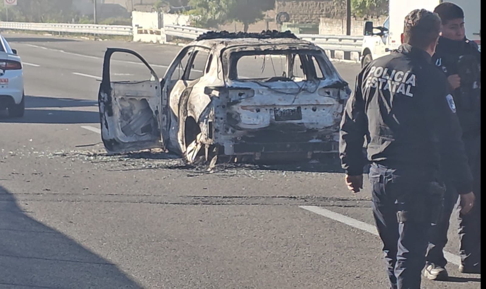 Durante la protesta, los inconformes prendieron fuego a neumáticos y también a una patrulla de la Policía Estatal, la cual terminó completamente calcinada, generando daños materiales y tensión en la zona.
